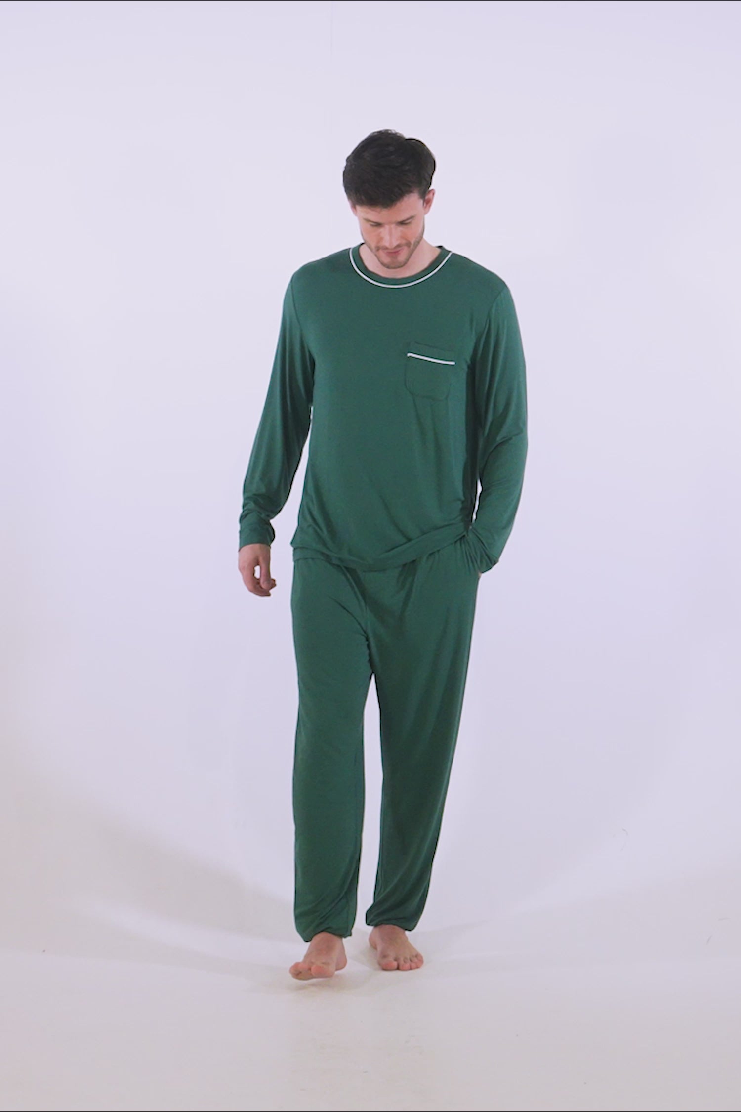 Available in four sophisticated colours—Grey Marl, Black, Green, and Midnight—this set features a long-sleeve top with a subtle pocket accent and full-length trousers with a cuffed ankle and an elasticated, functional tie waist for a customisable fit.