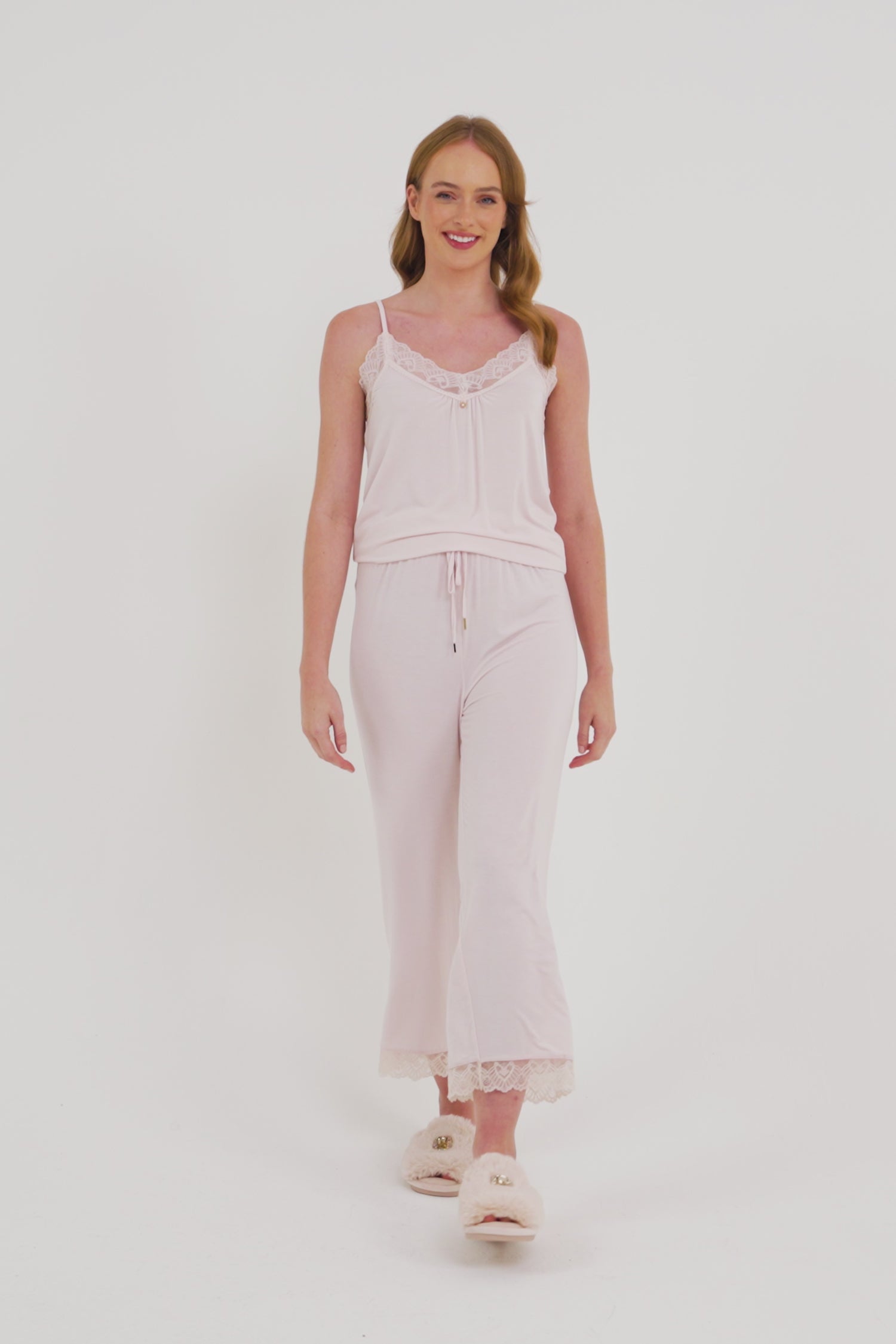 Bamboo Lace Cami Cropped Trouser Pajama Set in Powder PuffBamboo Lace Cami Cropped Trouser Pajama Set in Powder Puff