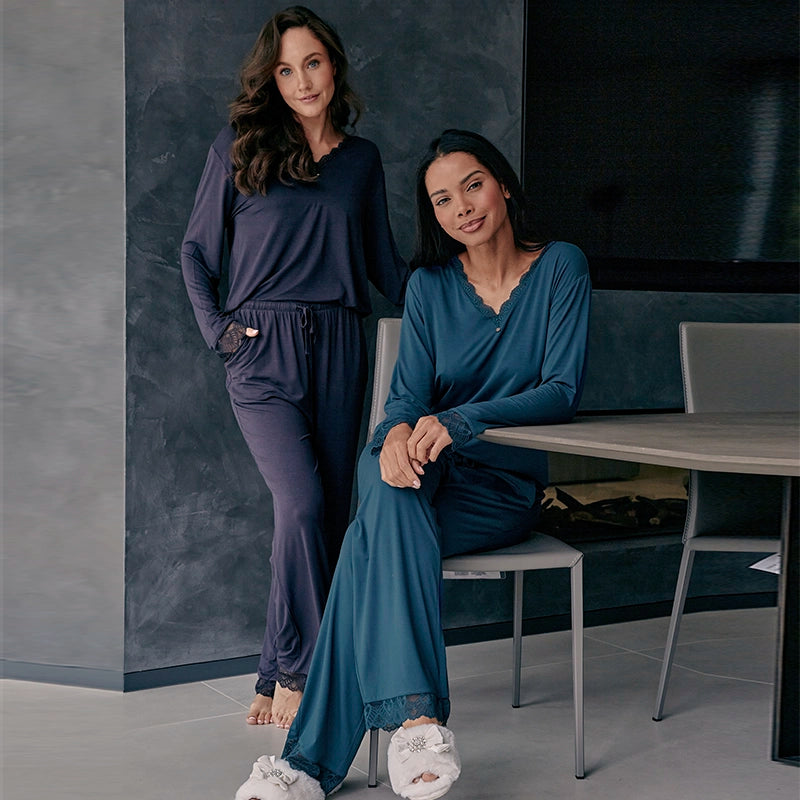 A straight fitting leg shape with an elasticated waistband. A flattering V-Neck adorned with intricate lace detailing.