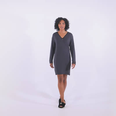 A relaxed, above-the-knee length style with a flattering V-Neckline and full-length sleeves.