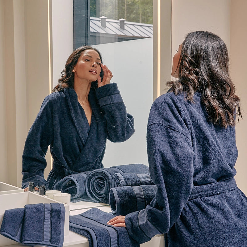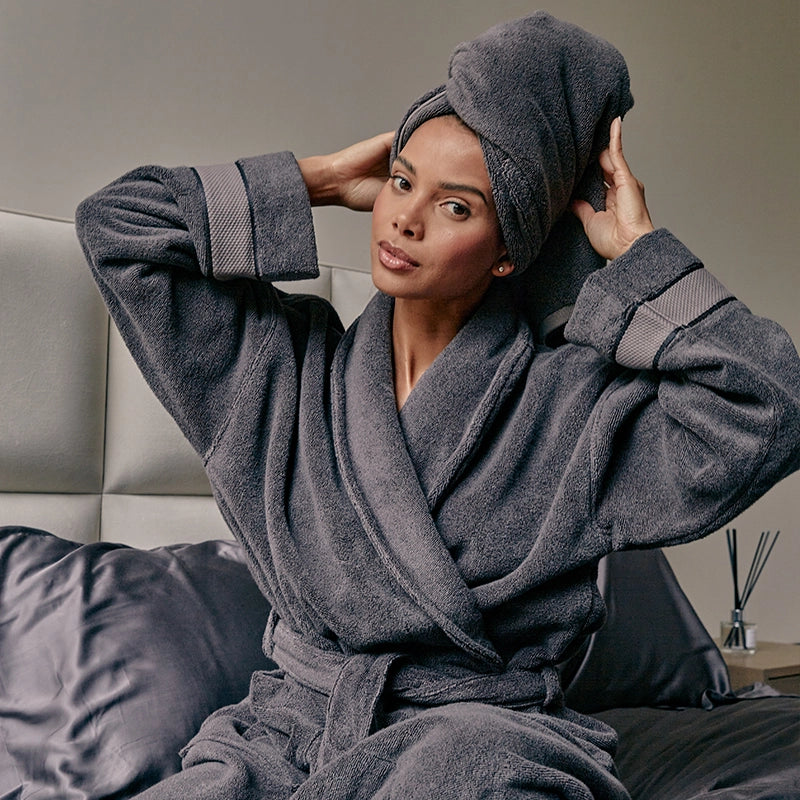 Our Towelling Robes feature an adjustable waist tie, handy hanging loop and a tonal decorative dobby border on the sleeves for added sophistication. Pair back with our Bamboo Towels.