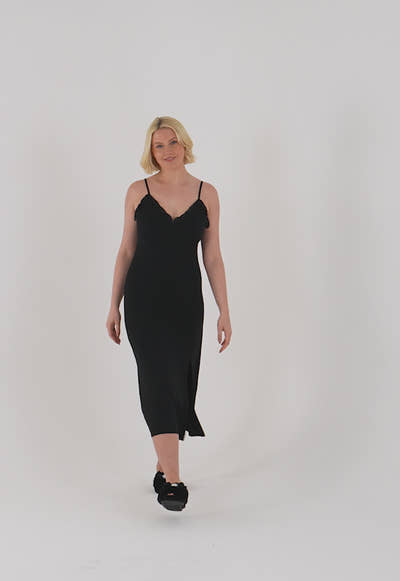 The latest collection to join our best-selling bamboo nightwear range. Crafted with exquisite attention to detail, the Bamboo Frill Chemise features delicate satin frill straps for a touch of feminine luxury. The longer length design and subtle side split offer both elegance and comfort, making it perfect for lounging whilst still feeling glamorous. The slim waist and shaped bust create a flattering fit for all figures. Elevate your sleepwear wardrobe with the sustainably sourced softness of bamboo and timeless charm of the chemise style. Available in Cornflower Blue and Black.
