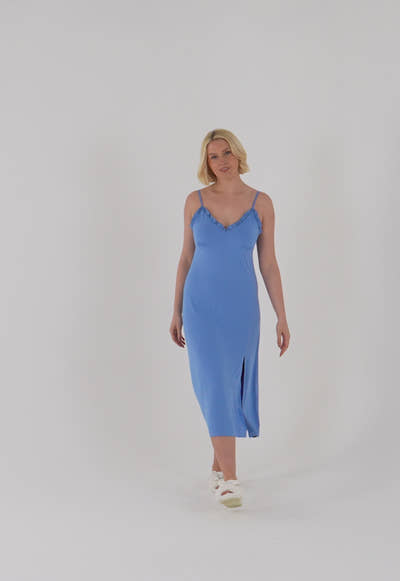 The latest collection to join our best-selling bamboo nightwear range. Crafted with exquisite attention to detail, the Bamboo Frill Chemise features delicate satin frill straps for a touch of feminine luxury. The longer length design and subtle side split offer both elegance and comfort, making it perfect for lounging whilst still feeling glamorous. The slim waist and shaped bust create a flattering fit for all figures. Elevate your sleepwear wardrobe with the sustainably sourced softness of bamboo and timeless charm of the chemise style. Available in Cornflower Blue and Black.