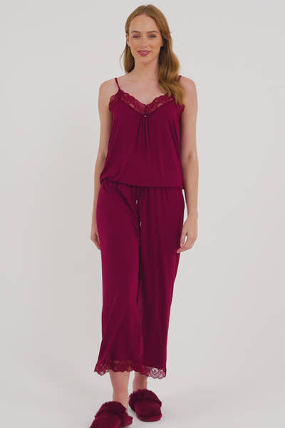 Bamboo Lace Cami Cropped Trouser Pajama Set in Bordeaux