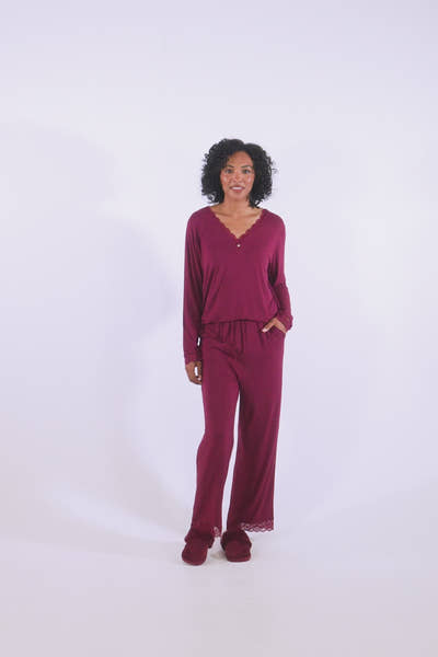 Bamboo Lace V-Neck Pyjama Set in Bordeaux