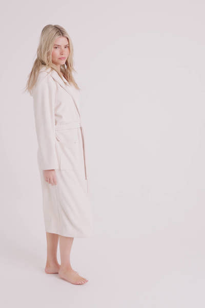 Wrap yourself in the plush comfort of our Velour Ribbed Robe, a longline style that falls to mid-calf for extra warmth. Crafted in premium-weight ribbed velour, it has a super soft, velvety touch inside and out, giving it a luxurious drape and cosy feel. A generous hood adds an extra layer of warmth, perfect for snuggling up on chilly days. Deep pockets add practicality, while internal ties and an external belt keep it comfortably in place. Available in soft mink or classic cream, it’s the perfect layer for slow mornings and relaxed evenings.
