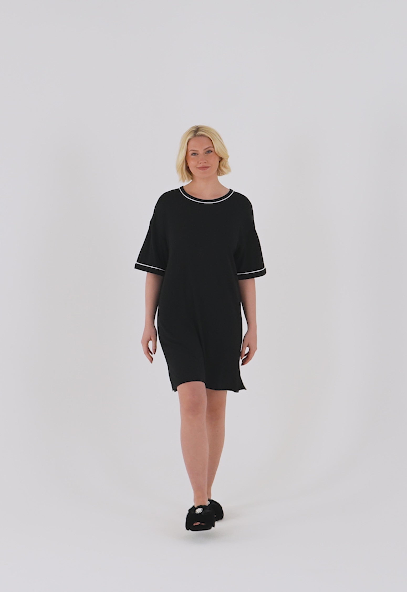 Crafted in a relaxed t-shirt dress style, it offers unparalleled comfort and style. Contrast piping trims delicately adorn the short sleeves and rounded neckline, adding a touch of sophistication to a timeless style. Perfect for lounging and unwinding in ultimate comfort and elegance. Experience luxury with our Bamboo Classic Tee Dress, the perfect choice for your nighttime relaxation. Available in Black, Pink and Midnight.