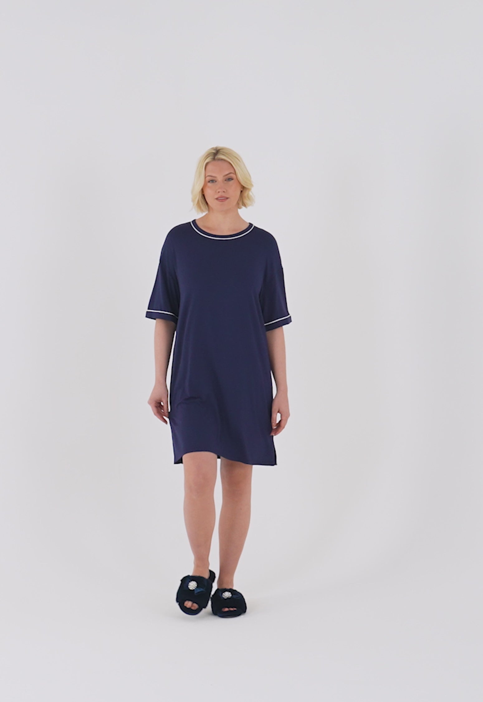 Crafted in a relaxed t-shirt dress style, it offers unparalleled comfort and style. Contrast piping trims delicately adorn the short sleeves and rounded neckline, adding a touch of sophistication to a timeless style. Perfect for lounging and unwinding in ultimate comfort and elegance. Experience luxury with our Bamboo Classic Tee Dress, the perfect choice for your nighttime relaxation. Available in Black, Pink and Midnight.