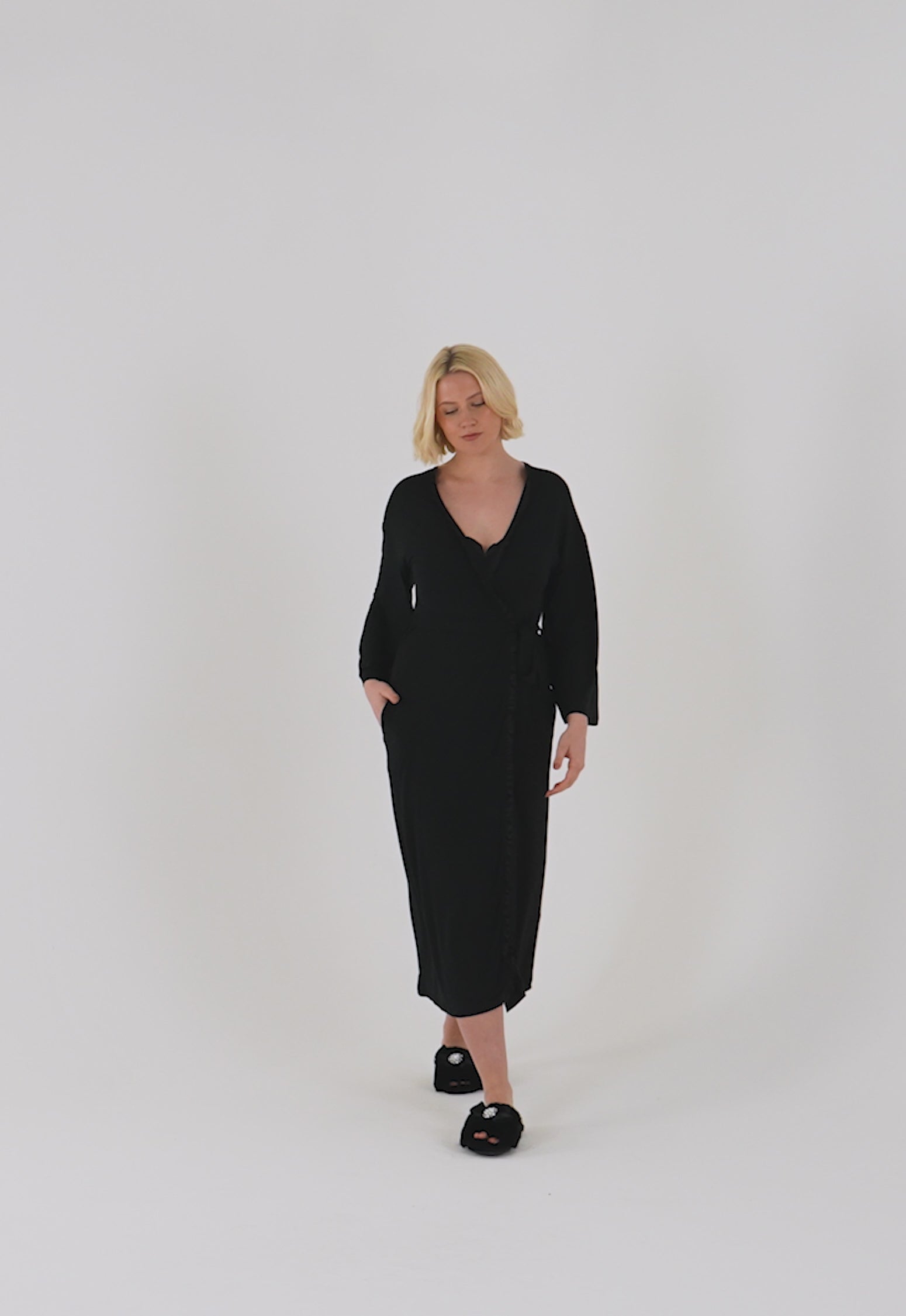 The latest collection to join our best-selling bamboo nightwear range. Our Bamboo Frill Kimono has an exaggerated length that gracefully drapes for a flattering and sophisticated look. The internal tie at the waist ensures a perfect fit, while the luxuriously soft external tie adds extra security. Adorned with a frill trim that cascades down the entirety of the kimono, exuding femininity. Pair it effortlessly with our Bamboo Frill Chemise or Bamboo Frill Cami Short Set for a coordinated look that epitomises luxury nightwear. Available in Cornflower Blue and Black.