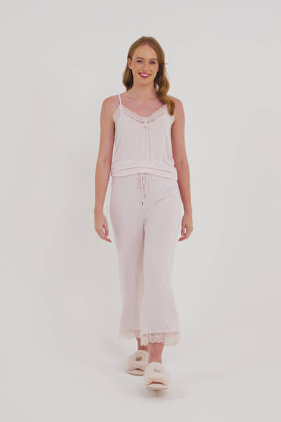 Bamboo Lace Cami Cropped Trouser Pyjama Set in Powder Puff