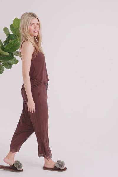 Bamboo Lace Cami Cropped Trouser Pyjama Set in Chocolate