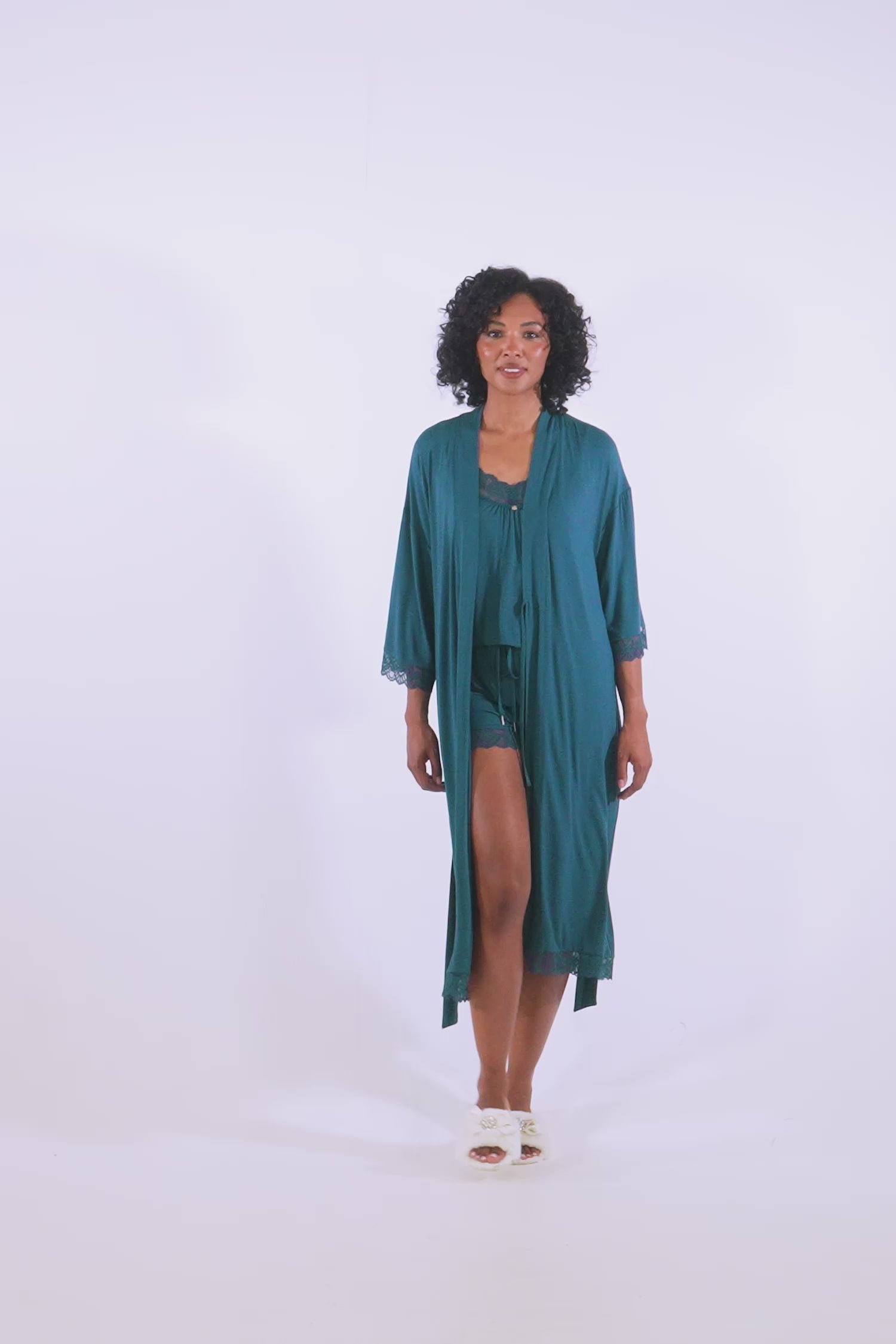 Our new Bamboo Lace Kimono has an exaggerated length and lace trims for extra opulence. The waist is secured with an internal tie, to ensure the perfect fit, with a luxuriously soft external tie fixed at the waist. The wide, kimono-style, sleeves are embellished with lace trims, adding textural and visual depth. An indulgent kimono for lounging in style. Pair with the matching Bamboo Lace Chemise and Faye slippers for the perfect night time attire.