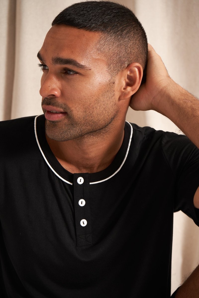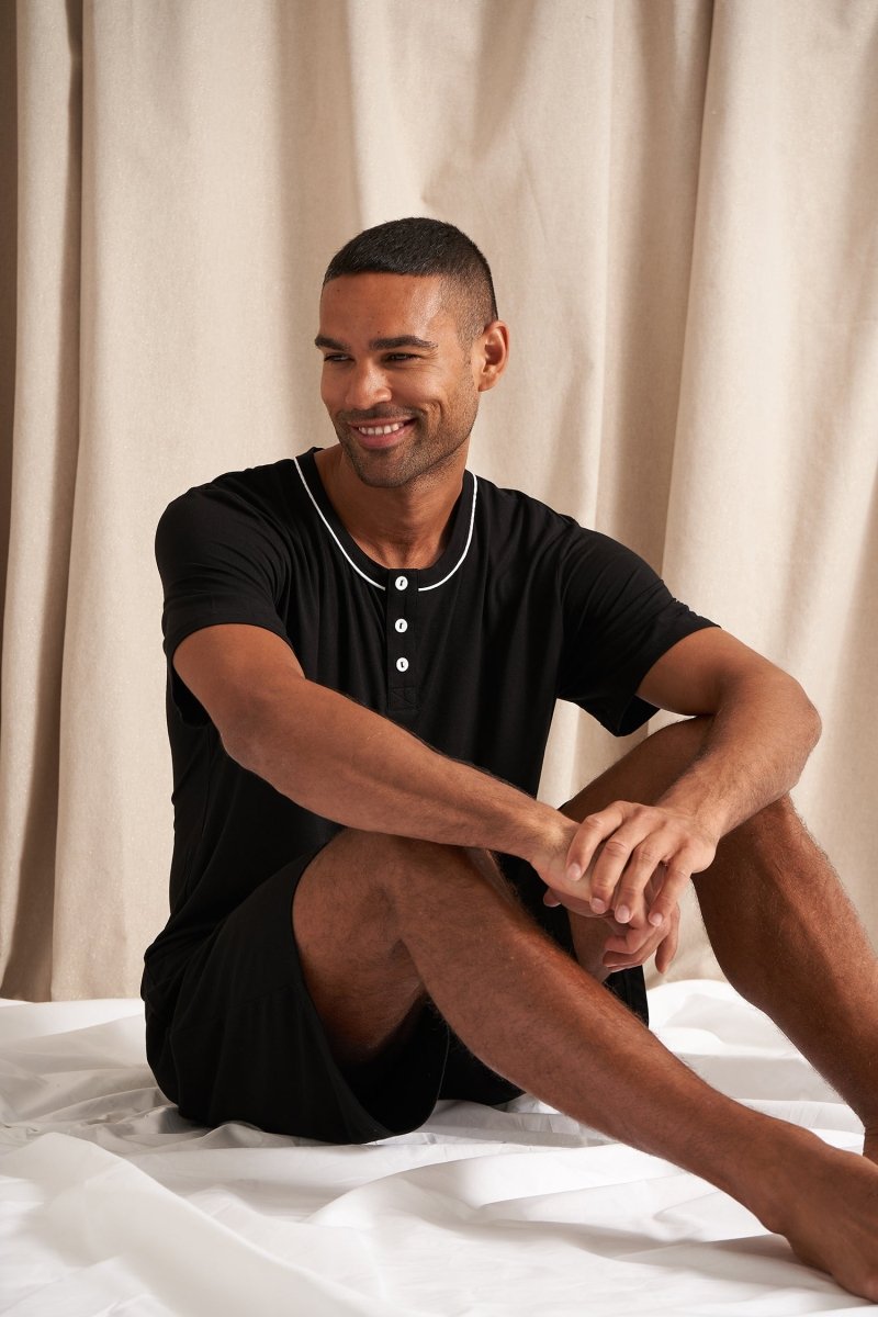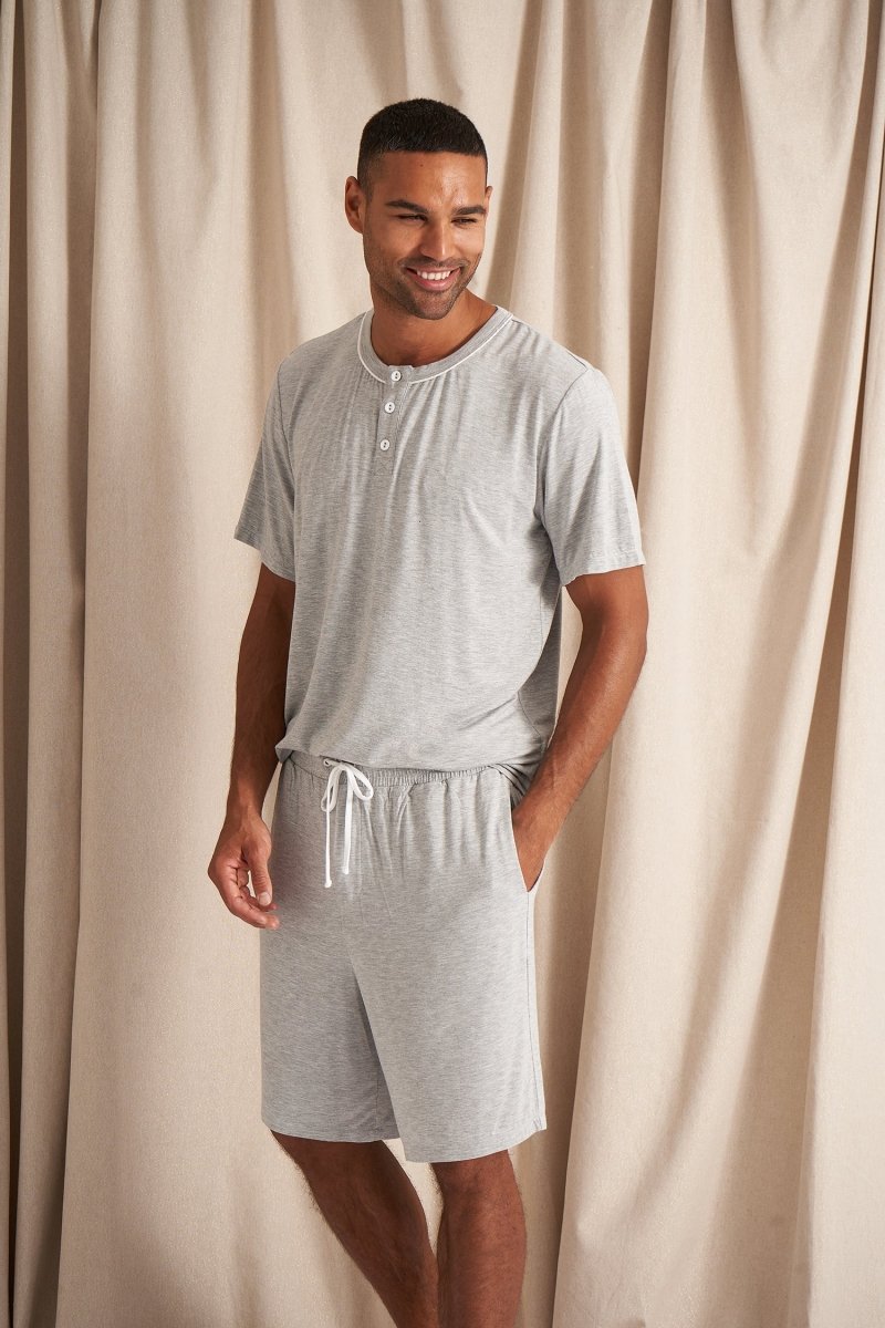 Available in four timeless colours—Grey Marl, Black, Green, and Midnight—this set features a short-sleeve top with functional buttons, allowing you to customise your look with ease. Paired with loose, relaxed-fit shorts that sit just above the knee and feature an elasticated, functional tie waist, this set combines effortless style with maximum comfort.