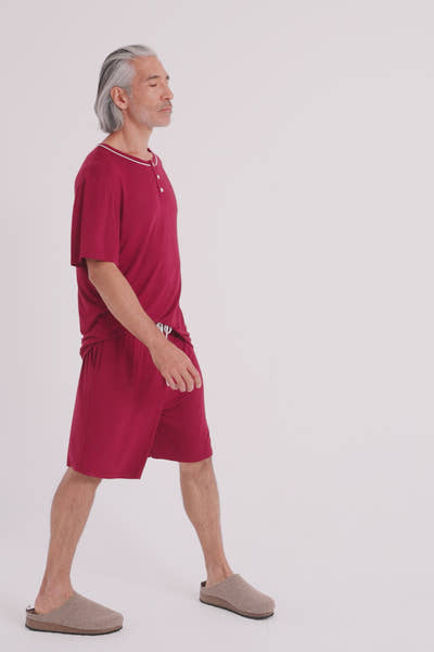Available in five timeless colours—Grey Marl, Black, Green, Midnight and Claret—this set features a short-sleeve top with functional buttons, allowing you to customise your look with ease. Paired with loose, relaxed-fit shorts that sit just above the knee and feature an elasticated, functional tie waist, this set combines effortless style with maximum comfort.