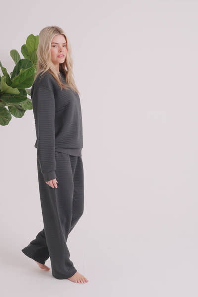 Relax in cosy comfort with this Quilted Jersey Lounge Set, designed with a relaxed fit for all-day ease. The wide-leg trousers feature an elasticated waistband with a functional drawcord for an adjustable, comfortable fit. The crew neck sweatshirt is detailed with ribbed cuffs, hem, and collar, adding subtle texture and structure. Crafted from soft quilted jersey fabric, this set is perfect for lounging or casual days at home. Available in versatile mink and charcoal shades.