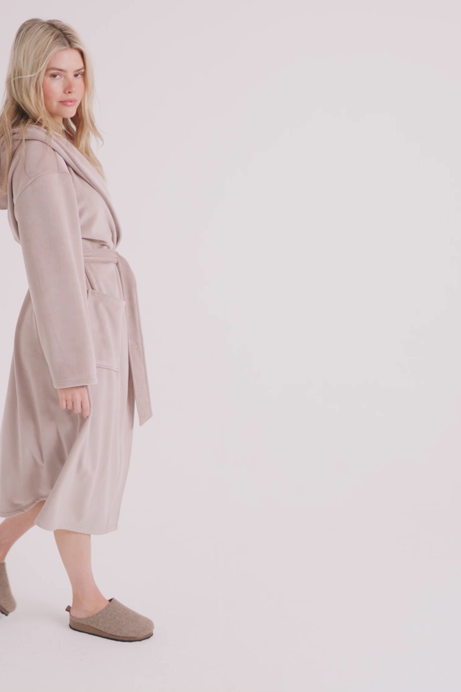 Wrap yourself in the plush comfort of our Velour Ribbed Robe, a longline style that falls to mid-calf for extra warmth. Crafted in premium-weight ribbed velour, it has a super soft, velvety touch inside and out, giving it a luxurious drape and cosy feel. A generous hood adds an extra layer of warmth, perfect for snuggling up on chilly days. Deep pockets add practicality, while internal ties and an external belt keep it comfortably in place. Available in soft mink or classic cream, it’s the perfect layer for slow mornings and relaxed evenings.